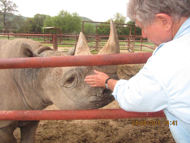 The Black Rhinoceros, Diceros bicornis, is critically endangered in it's home range in Africa due to poaching for its horns - used to make handles for ceremonial daggers called jambiyas for a growing number of wealthy sheiks. This male is one of a protected breeding population kept at Fossil Rim Wildlife Preserve near Glen Rose, Texas. Photo by Jenny Clark.