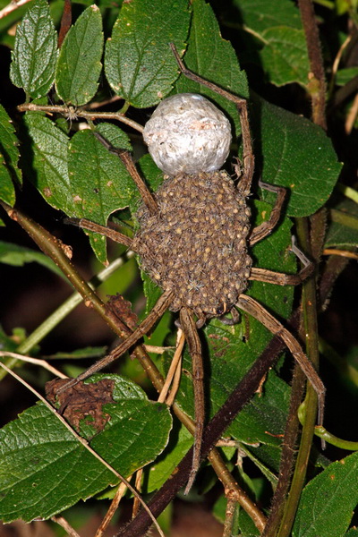 Female Wolf spider, Rabidosa species? Carrying her brood and an egg sack! What a Mom. Hornsby Bend Natural Area, Austin, Texas 08/29/07